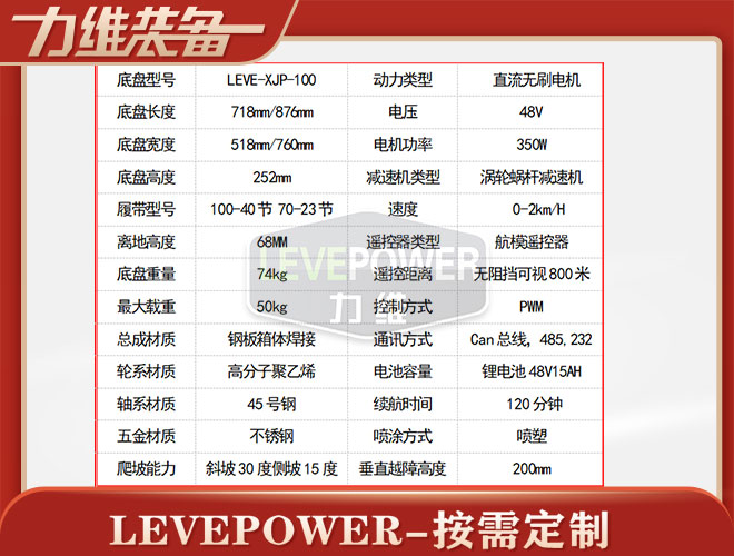 履帶式擺臂機器人底盤長876mm,底盤寬760mm,底盤高252mm,履帶車自重74KG,載重50KG,箱體采用鋼板焊接而成,無線遙控履帶擺臂機器人搭載48v350W直流永磁無刷電機,渦輪蝸桿減速機增大動力,履帶底盤轉彎動力更強,爬坡更有勁。加上合理的擺臂設計,爬樓越障性能強,遙控車搭配48V20AH鋰電池續航時間更長。
