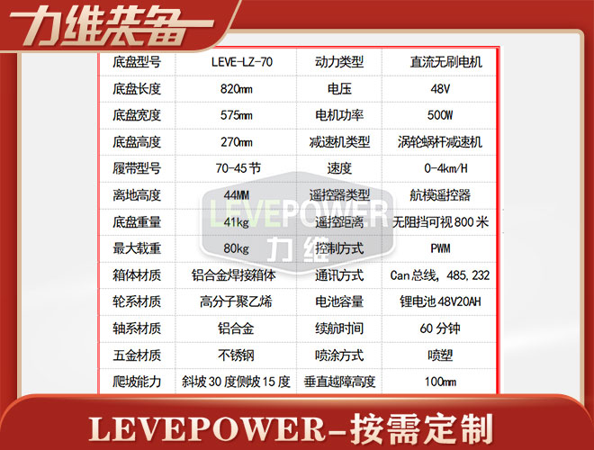 LEVE-LZ-70特種橡膠履帶底盤采用天橡膠內加凱夫拉纖維經過高溫硫化擠壓成型,材質輕、耐磨性能強,是一款不錯機器人橡膠履帶。 履帶底盤長820mm,履帶底盤寬575mm,履帶底盤高270mm,無線遙控履帶底盤箱體采用鋁合金材質焊接而成,防腐性能好。履帶底盤動力采用48V500W直流無刷電機,渦輪蝸桿減速機動力更強,轉彎靈活。履帶底盤電池采用48V20AH鋰電池,續航時間更長,是一款不錯的機器人橡膠履帶。